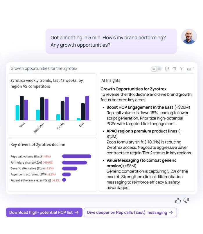 BI tools show you what happened last quarter. Vanilla LLMs can answer simple questions but choke on enterprise pharma complexity—they don't know the difference between TRx and NBRx or how to handle mismatched patient identifiers across data sources. Agentic commercial analytics and insights platforms understands pharma commercial logic, pulls from multiple systems in a single query, and validates its own outputs before surfacing an answer. When you ask why NBRx dropped in a region, it investigates competing hypotheses rather than just returning a chart.